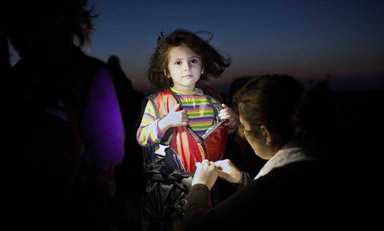A Syrian child gets assistance to remove her life jacket upon her arrival on an inflatable boat carrying migrants on the Greek island of Kos after crossing a part of the Aegean Sea between Turkey and Greece, Aug. 13, 2015 – by Angelos Tzortzinis from his 2015 collection.
